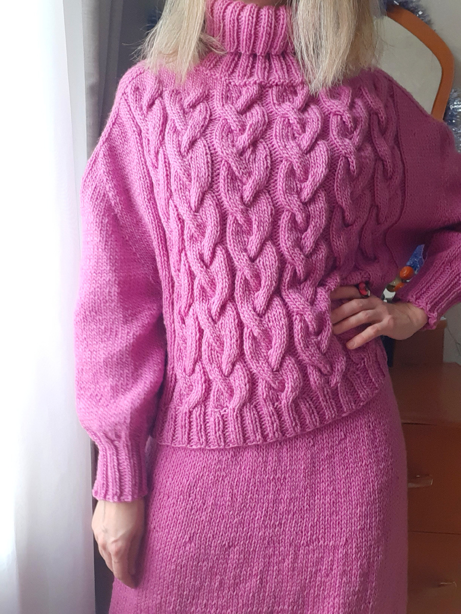 Всем привет! Очень трудно сфотографировать юбку полностью в условиях квартиры. Лучше, конечно, получаются фото на природе. Но зимой приспосабливаюсь фотографировать в помещении. Поэтому не судите строго: некоторые фото юбки частями, не супер качества, но хотелось показать вам результат, что получилось. Вязала костюм из пряжи Nako Superlambs Special, метраж 100г = 200м Пряжа не плохая, классическая турецкая полушерсть. Цвет 2243 - розовый флокс Размер 44-46 ширина юбки по талии - 36 см ширина по бёдрам - 54 см длина - 77 см Спицы я использовала только один номер - 4,5 (и пояс, и основное полотно) Плотность моего вязания: 1см = 1,6 п 1см = 2,2 ряда Расход: примерно 350 г Вязала сверху вниз по кругу. Набирала 106 п + 1 п (на круг) Сразу после пояса сделала ряд с прибавками, далее каждые 22 ряда делала ряд с равномерными прибавками - до уровня бёдер (в самом широком месте). Далее вязала прямо вниз. По низу провязала несколько рядов резинки 2 на 2 и закрыла петли простым способом, без