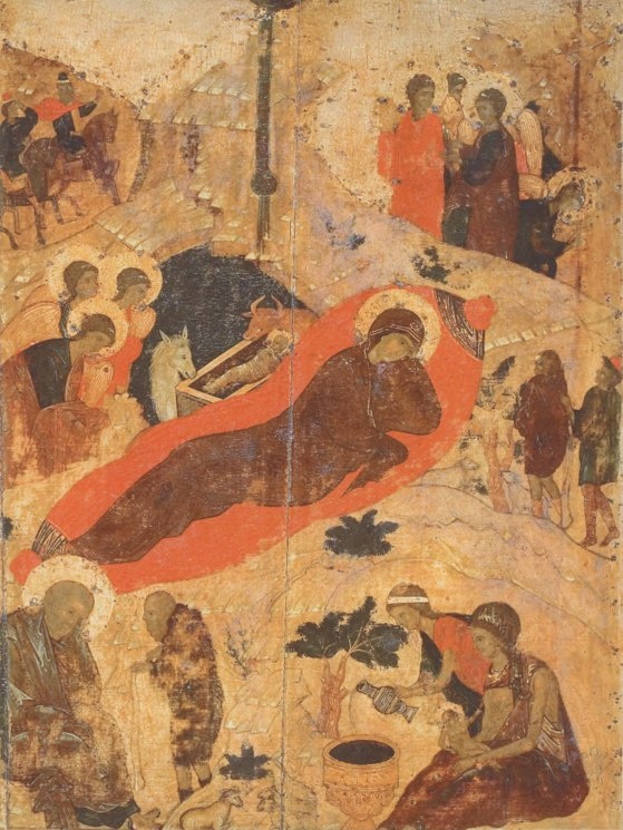 Вот знаменитая икона Рождества Христова из праздничного ряда иконостаса Благовещенского собора Московского Кремля, домовой церкви русских царей. В настоящее время утвердилось мнение, что она написана в XV веке, если не самим Рублевым, то по его прорисям.