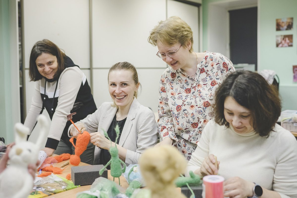 На столе вперемежку лежат большие клубки синей, белой и коричневой пряжи, ножницы, наборы крючков. Рядом с ними листы со схемами вязания: «Набираем 16 ВП, вяжем от второй. 1 СС, 1 СБН, 1 ПСН». Мастерицы вязальной мастерской превращают эти шифровки в мягкие игрушки: осьминогов, китов, медведей. На другом конце стола Елена и Адиль мастерят кукольную обувь: вырезают по выкройке заготовки из кожи, склеивают ботиночки, обрабатывают швы пилочкой, делают крохотные дырочки для шнурков.
