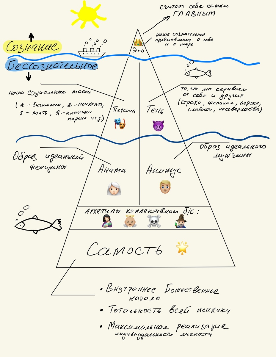 Цель этого поста крайне амбициозна — попытаться объяснить крайне сложную психологическую концепцию простыми словами. Да еще и так, чтобы вас заинтересовать. Получится у меня или нет — напишите в комментариях! Итак! Если представить психику в виде трехэтажного айсберга, то получится следующая веселая пирамидка: Этаж 1. Вершина айсберга — сознательный этаж. Там находится наше 👑 Эго — штука, которая думает, что она самая главная и все решает. Как и всё маленькое пытается постоянно раздуваться, чтобы казаться больше, чем есть на самом деле. Но оно лишь вершина айсберга. Этаж -1. Личное бессознательное — малая подводная часть айсберга. Там же интересней. Это часть нашего бессознательного сформированная личным опытом. Тут находятся 2 полуосознаваемые части нашей личности: 🎭 Персона — это то, кем мы хотим, чтобы нас видели. Типичный пример: анкета на сайте знакомств. 😈 Тень — наоборот, то, что мы скрываем от других и от самих себя. Простыми словами — наши внутренние демоны. Эта