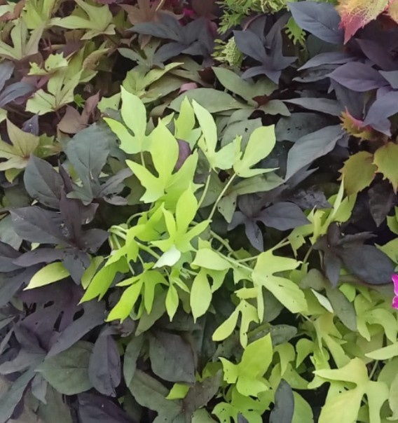 Наиболее интересна для посадки в кашпо и контейнеры ипомея Батат, которая сравнительно недавно стала выращиваться как декоративный вид. Лиана приобрела популярность в цветочных композициях благодаря оригинальности, разнообразию расцветок листвы и направлению роста растения, удобного для . в подвесные кашпо. Ипомея Батат имеет клубневидное съедобное корневище с мякотью жёлтого или сиреневого цвета. Размножается исключительно вегетативным способом, цветы немногочисленны. Размножить цветок можно делением клубня или черенкованием. Ипомея Батат, также известная как сладкий картофель, стала одним из самых популярных декоративных растений последних лет. Это растение привлекает внимание благодаря своей богатой листве, которая может иметь пурпурные, вишневые, свекольные и светло-зеленые оттенки. Ипомея Батат демонстрирует стабильную декоративность на протяжении всего теплого сезона. Условия роста Ипомея Батат хорошо развивается как на открытом солнце, так и в полутени. Она отлично сочетается