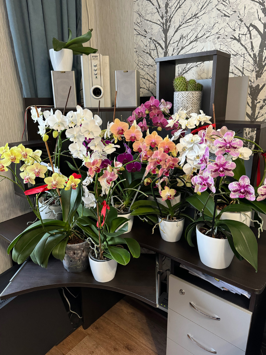 Несмотря на то, что орхидеи тропические растения, оптимальная температура для хорошего роста 24-26 градусов, с большим количеством рассеянного света. Но свободный южный подоконник не давал мне спокойно жить😅 И мы поставили венецианские жалюзи☀️ Их можно удобно регулировать, чтобы не было прямых солнечных лучей. Конечно, на южном окне в южном регионе условия не такие идеальные, но орхидеи там растут и даже цветут. На фото как раз они🌺 В тёплое время года я просто чаще использую препарат НВ-101, купаю их под душем и после опрыскиваю Эпин Экстра и через полив добавляю Янтарин в воду. Благодарю за 👍🏻 И пышного цветения вашим орхидеям🌺 На вопросы отвечаю в комментариях ⬇️