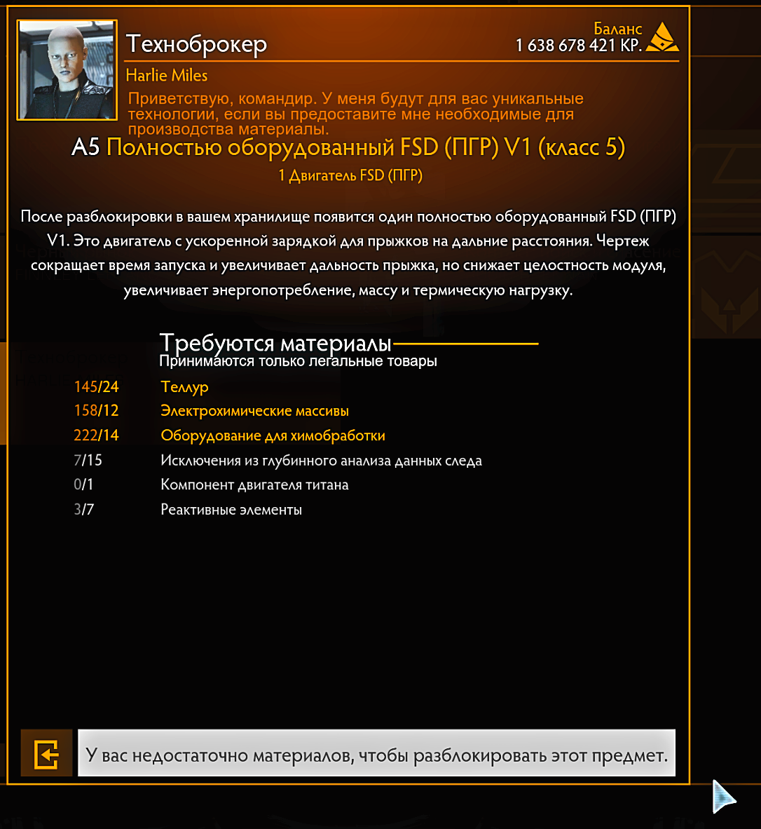 Первым делом мне нужно было добраться до космопорта в безопасной системе. Shinrarta Dezhra не подходила, так как там слишком много ганкеров. С другой стороны, если бы меня убили в Sol таргоиды, я бы оказался так же в Colonia. Поэтому я решил отправиться в систему Veroandy, где началась моя карьера пилота. Теперь я понимаю, что установка антикоррозийных стеллажей была правильным решением. Сейчас я летаю и собираю разные вещи, оставшиеся после таргоидов, хотя сам не знаю, зачем они мне. За 30 минут я нашёл один из компонентов двигателя. Будьте осторожны при сборке, так как этот компонент очень хрупкий. За вечер я случайно разбил целых три таких компонента. Среди обломков я так же обнаружил другой необходимый мне материал — реактивные элементы. Как я уже и говорил пузырь довольно опасное место при сборке материалов меня пытался убить... Однако моя скорость в 592 метра в секунду была слишком велика для него, и он не смог меня догнать. Мне удалось успешно уйти от него, и даже призматическ