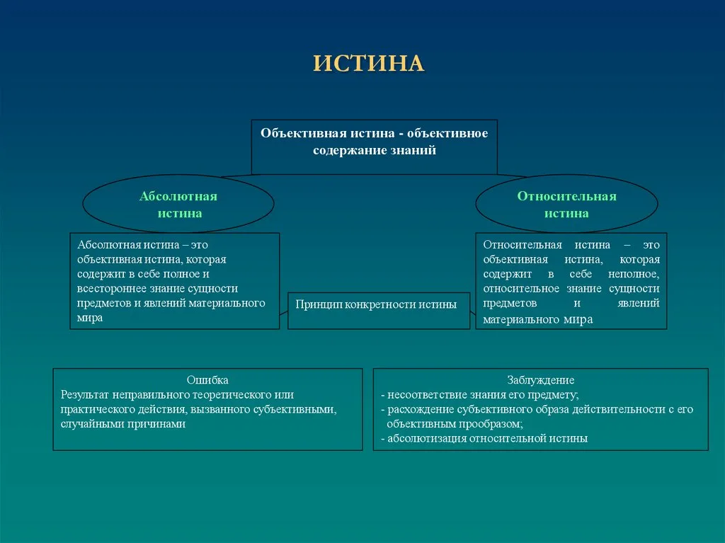 Истину определяют как адекватное отражение объекта познающим субъектом, воспроизводящей реальность такой, какая она есть сама по себе, вне и независимо от сознания. Истина есть адекватное отражение реальности в динамике ее резвия. Это придает ей особ ценность, связанную с прогностическим измерением. Истинные знания дают людям возможность разумно организовывать свои практические действия в настоящем и предвидеть будущее.