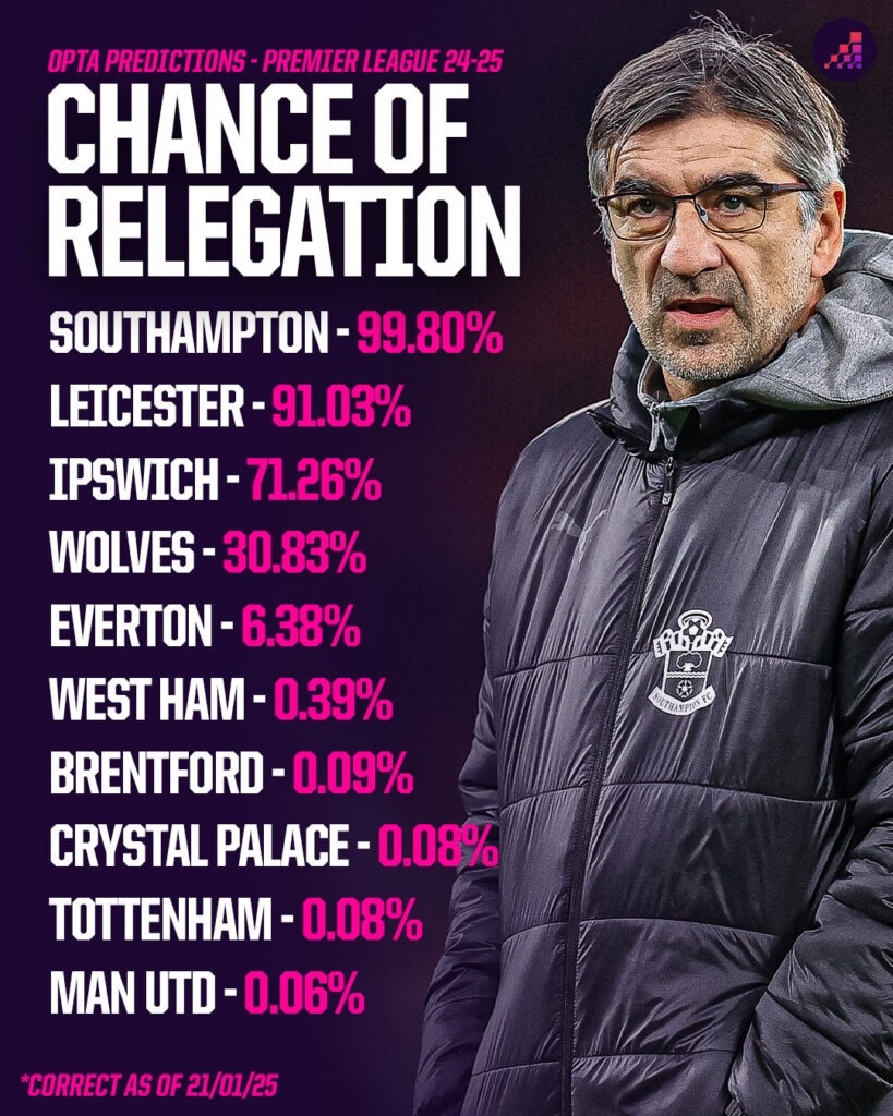 В тройку аутсайдеров в настоящее время входят «Саутгемптон», «Лестер Сити» и «Ипсвич Таун», а «Вулверхэмптон Уондерерс» находится выше зоны вылета по разнице забитых и пропущенных мячей. Несмотря на то, что до конца сезона осталось 16 матчей, суперкомпьютер Opta не видит другого исхода, кроме как вылет трёх аутсайдеров в конце сезона.