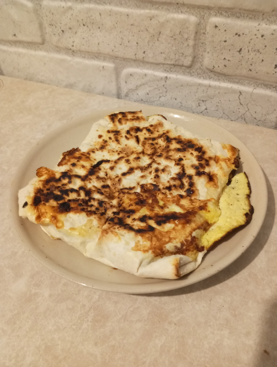 Готовила с вечера правда, но только потому что муж работает в ночную смену, а завтрак с утра пораньше (7утра) готовить не хочется. Пирог как я люблю быстрый в приготовлении, занимает не больше 15 минут, поэтому готовлю его в основном утром. Готовится на сковороде! * тонкий лаваш (1 штука); * 3 яйца; * 1 помидор или болгарский перец (у меня сегодня перец); * 30 грамм тёртого сыра (например, Тильзитер); * 50 грамм пастромы (можно заменить ветчиной или грудинкой); * зелень, соль и перец по вкусу. Я использовал 1 квадрат лаваша весом около 80 грамм, который купила в упаковке из 4 штук. В сухую сковороду с высокими бортами кладем расправленный лист лаваша, разбиваем в него яйца, натираем сыр, солим, перчим и аккуратно вилкой перебалтываем массу. Пастрому/ветчину режем кусочками и выкладываем равномерно к яичной массе, так же поступаем с овощами и зеленью. Аккуратно загибаем края лаваша внутрь, закрывая начинку, получается квадратный/прямоугольный конверт⬇️. Сковородку ставим на включенну
