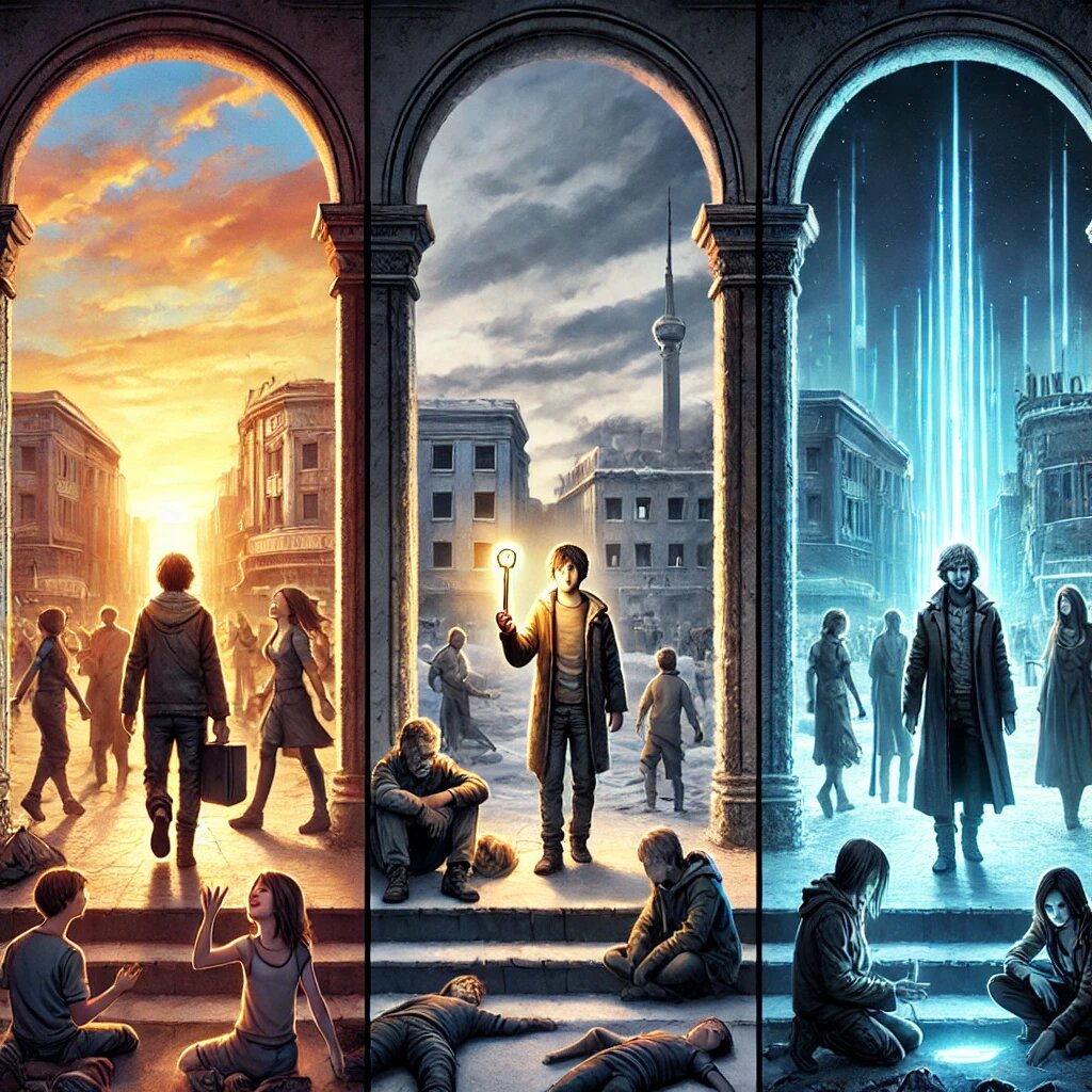 Заранее благодарю тех кто прочёл рассказ. Эта финальная глава произведения. Но к сожалению я не смог сделать выбор финальной сцены. Я решил выложить три концовки...Вам решать какой финал будет интереснее для Вас. Егор, Лиза и Артем стояли на площади, которая теперь была наполнена жизнью. Люди смеялись, дети играли, а небо над головой было чистым и ясным. Ключ в руке Егор постепенно терял свой свет, словно его работа была завершена. Он посмотрел на своих друзей, и в его глазах читалась благодарность. — Мы сделали это, — сказал он, его голос был полон облегчения. — Мы спасли их. Лиза улыбнулась, ее глаза блестели от слез. — Мы спасли не только их, — сказала она. — Мы спасли себя. Артем кивнул, его лицо было серьезным, но в его глазах читалась гордость. — Этот ключ… он изменил все, — сказал он. — Но теперь он должен исчезнуть. Его сила слишком велика, чтобы оставаться в этом мире. Егор посмотрел на ключ, который теперь был почти обычным куском металла. Он знал, что Артем прав. Ключ выполн