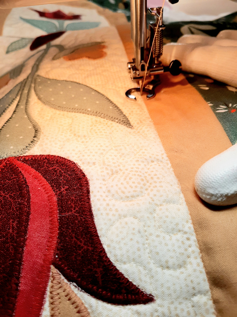 Стегаю нитками в тон. Двигаюсь от середины к краю. Это обязательное условие, которое помогает избежать пузырей и морщин. Это как клеить обои. Мы их разглаживаем от середины к краю, выгоняя воздух. Так и здесь. Середину я стегала "мозгами". Вокруг аппликации нужна простая покрывная стежка. И лучше "мозгов" здесь ничего не ляжет. Узкий бордюр стегается не всегда. Если он совсем узенький, то его можно оставить так. Но у меня 3 см и я на нем положила завитки. Ну а широкий бордюр я решила стегать перьми.