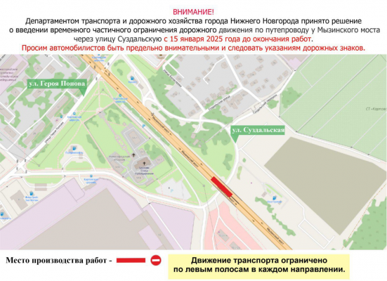 Ограничения введут уже с 15 января. Ремонтные работы на путепроводе Мызинского моста через улицу Суздальскую в Нижнем Новгороде стартуют 15 января, и продлятся почти два года - до декабря 2026 года, сообщил департамент транспорта и дорожного хозяйства администрации Нижнего Новгорода.