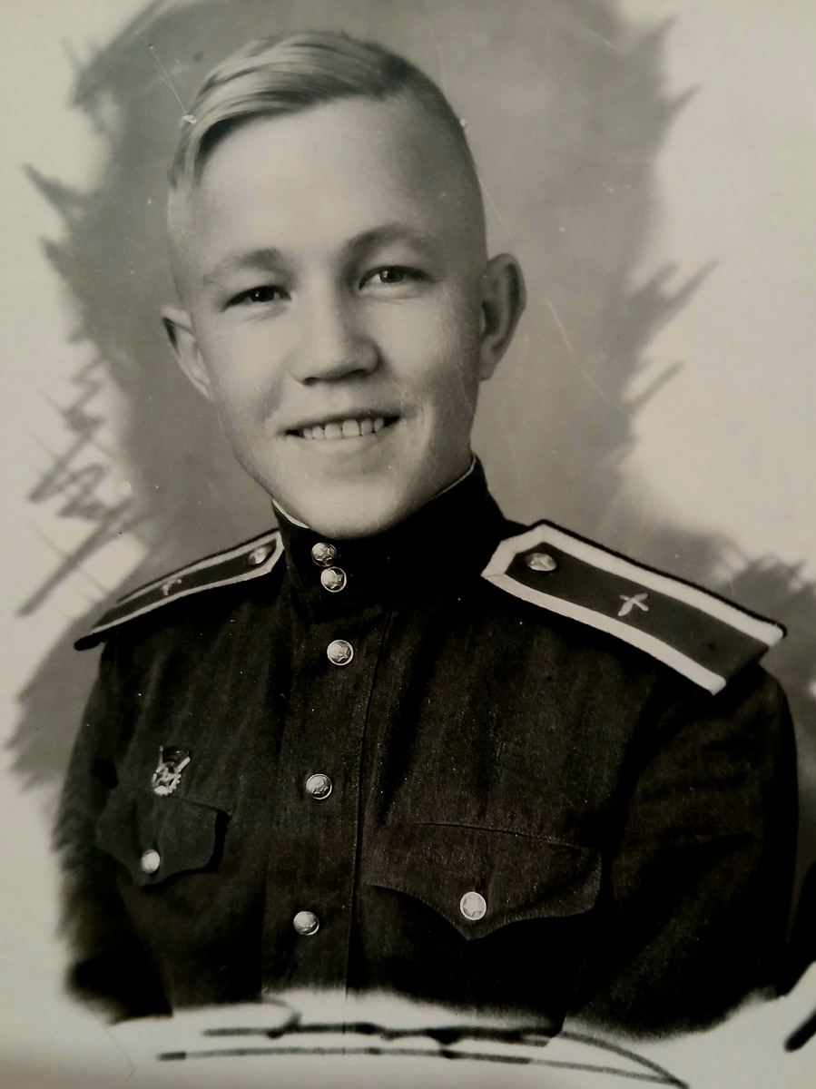 Фотография воспитанника военно-воздушной спецшколы в гимнастерке образца 1943 года с погонами курсанта, изготовленными по техническим условиям 1947 года. На груди молодого человека виден знак комплекса «Готов к труду и обороне» второй ступени образца 1946 года. На оборотной стороне снимка имеется подпись: «Сашке от Сашки в день выпуска из спецухи 26/VI-51 г. г Ленинабад». Специальными школами в СССР являлись средние общеобразовательные учебные заведения, готовившие юношей 8-10-х классов для поступления в различные военные училища. Начало таким школам было положено в 1937 году – тогда в Москве, Ленинграде и ряде других крупных городов возникли так называемые артиллерийские школы, в 1940 году – военно-морские и военно-воздушные. Подготовка к поступлению в военные училища велась как в стенах учебного заведения, где кроме общеобразовательных предметов изучались и военные дисциплины, так и во время двухмесячного летнего лагерного сбора. Артиллерийские средние школы функционировали в 1937-1