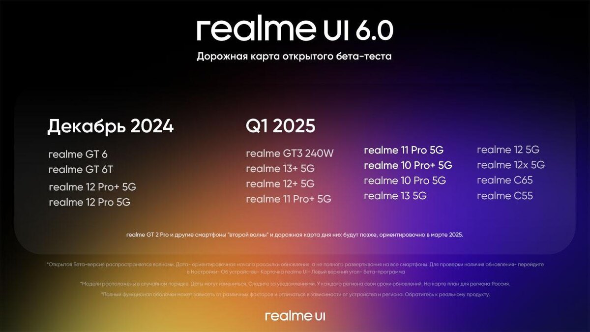 Всем привет! Мы запустили первый смартфон с realme UI 6.0, realme GT 7 Pro. А значит можно анонсировать и начать обновлять и другие смартфоны! В этом году мы решили анонсировать первую волну, а чуть позже вернуться к другим моделям. Уже в этом году попробовать новую версию realme UI 6.0 и Android 15 смогут владельцы realme GT 6 и GT 6T, а также 12 Pro серии! Множество других смартфонов получат обновления в первом квартале. Просим обратить внимание на дисклеймеры! 1) Где обновление для Note 50 до новой версии оболочки? Инженеры компании начали рассылать обновление, но была найдена ошибка, которая могла критически повлиять на пользовательский опыт. Сейчас планы выпустить обновление до конца года. Приносим извинения за задержку. 2) realme 12х 5G? Что за смартфон? Смартфон является упрощенной версией realme 12 5G и продавался с версией прошивки для региона Россия на AliExpress. Оставить его без обновления мы не можем.