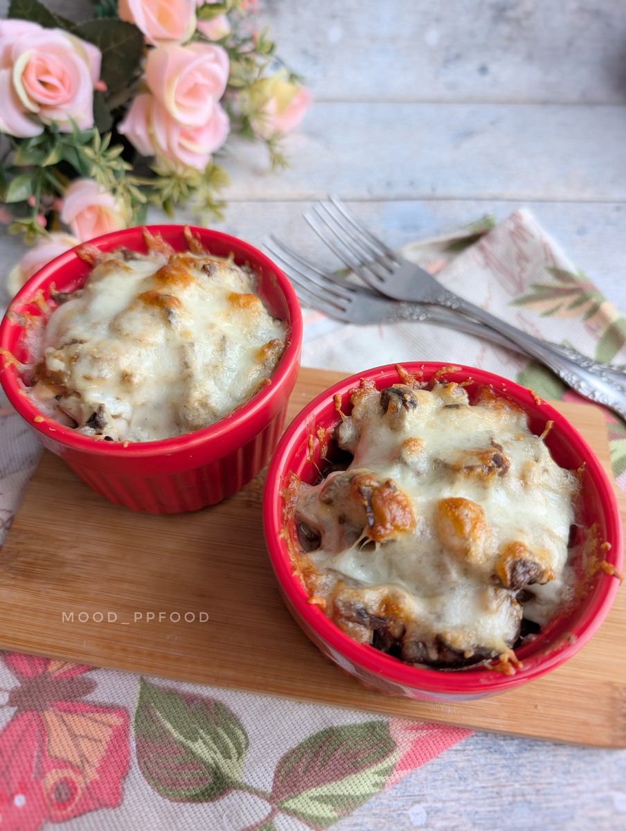 Печень куриная - 200 г. Шампиньоны свежие - 100 г. Лук репчатый - 50 г. Сливки 20% - 100 г. Сыр - 30 г. Чеснок - 2 зубчика. Масло топлёное - 10 г. Соль, перец. 1️⃣ 50 г. лука, 200 г. печени и 100 г. шампиньонов очищаем и нарезаем кубиками. 30 г. сыра натираем на мелкой тёрке. 2️⃣ Обжариваем лук на масле до мягкости и добавляем шампиньоны. Готовим, периодически помешивая 4-5 минут. 3️⃣ Добавляем печень и снова помешивая, обжариваем минут 5. 4️⃣ Выдавливаем 2 зубчика чеснока, наливаем 100 г. сливок и помешивая, доводим до кипения. Убираем с плиты. 5️⃣ Раскладываем шампиньоны с печенью по кокотницам, посыпаем сыром. 6️⃣ Убираем в разогретую до 180° духовку на 10 минут. Готово, приятного аппетита 😋