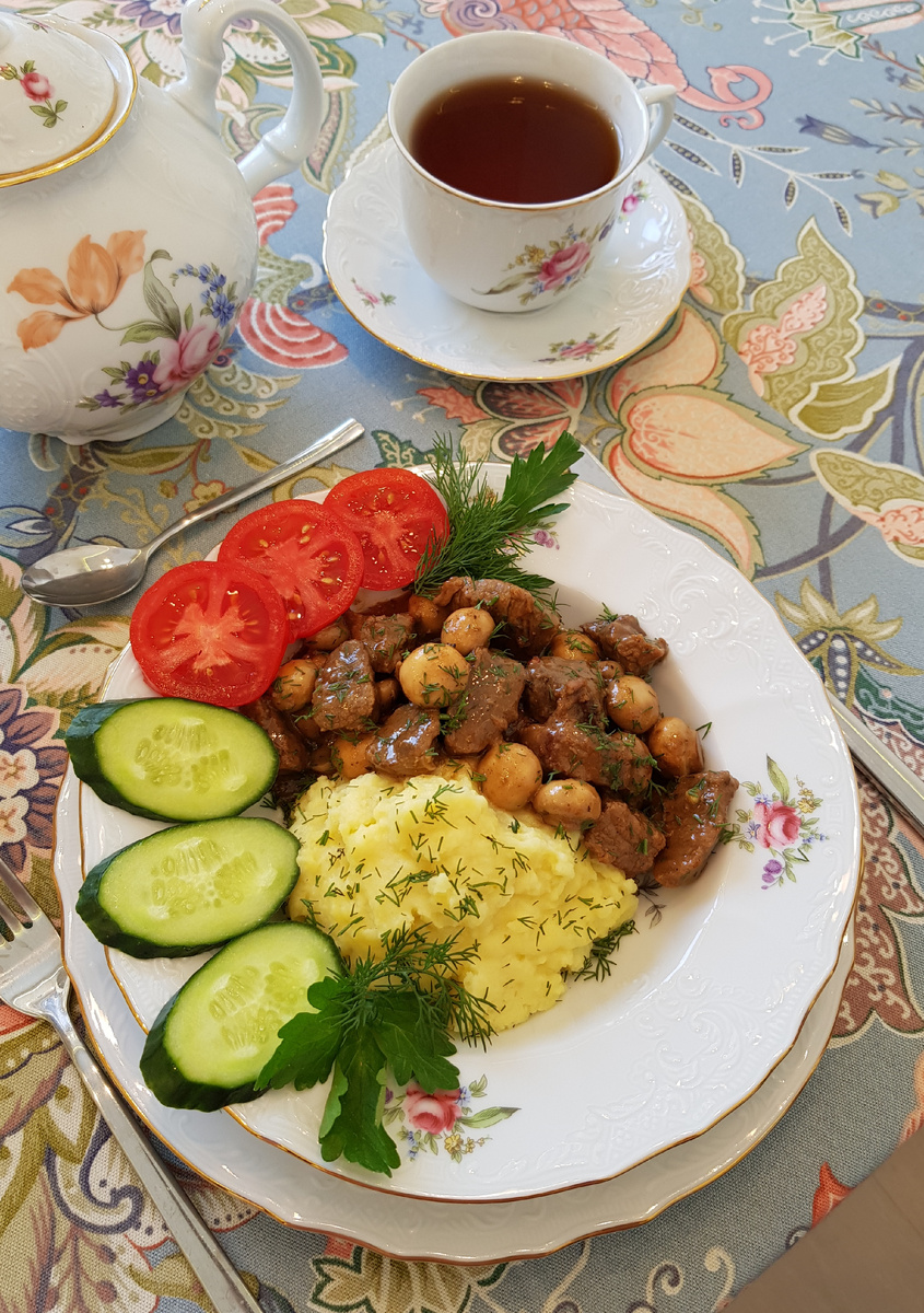 Добрый день, дорогие друзья! На улице сегодня холодно в Сибири и я предлагаю согреться горячим сытным блюдом! Для приготовления нам понадобятся: 1,2 килограмма телятины, 400 грамм шампиньонов, 1/4 лимона, 1 столовая ложка сливочного масла, 3 столовые ложки подсолнечного масла, 1,5 чайные ложки соли, 2 чайные ложки приправы прованские травы, 1/4 чайной ложки черного молотого перца, 1/4 чайной ложки молотого мускатного ореха. Приготовление: 1 столовую ложку растительного масла и 1 столовую ложку сливочного масла нагреть на сковороде. Выложить шампиньоны. Обжарить шампиньоны со всех сторон в течение 5 минут, посолить, посыпать перцем и мускатным орехом. Перемешать и полить лимонным соком. Выложить грибы в емкость. На растительном масле обжарить мясо. Посыпать приправой, перемешать, накрыть крышкой, уменьшить огонь до среднего уровня и тушить 60 минут. К мясу в конце тушения добавить грибы, перемешать. Подавать жаркое с картофельным пюре, свежими овощами и зеленью. Приятного аппет