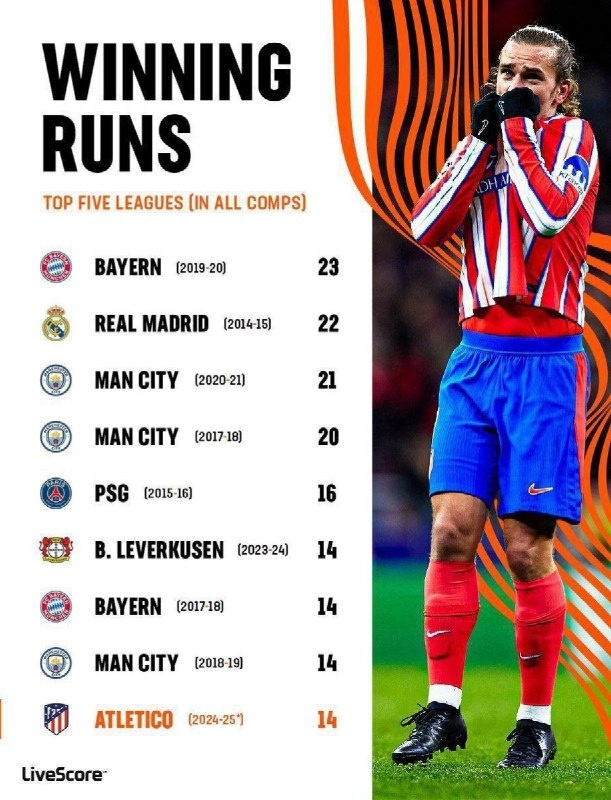 В 19-м туре Ла Лиги «Атлетико» со счетом 1:0 обыграл «Осасуну». Подопечные Симеоны укрепили свое лидерское положение в чемпионате Испании, они опережают «Мадрид» на одно очко, а «Барсу» – на шесть. «Матрасники» оказываются сильнее соперника уже 14 матчей подряд, для столичного клуба это рекордная победная серия. «Атлетико» вошел в элитный список клубов топ-5 лиг Европы с самыми длинными победными сериями во всех турнирах. Дольше всего среди европейских грандов не проигрывала «Бавария». В сезоне-2019/20 команда под руководством Ханси Флика побеждала в 23-х матчах подряд во всех турнирах! Немного от мюнхенцев отстал «Мадрид», чья победная серия в сезоне-2014/15 достигла 22-х игр. Следом идет «Манчестер Сити» – серии «горожан» попали в список три раза. Самые длительные победные серии клубов из топ-5 лиг Европы Результаты во всех турнирах Как высоко в этом списке сможет подняться «Атлетико»? Лучшие игроки 2024 года по версии Opta. В топ-10 сразу пять представителей Бундеслиги, Родри лишь в