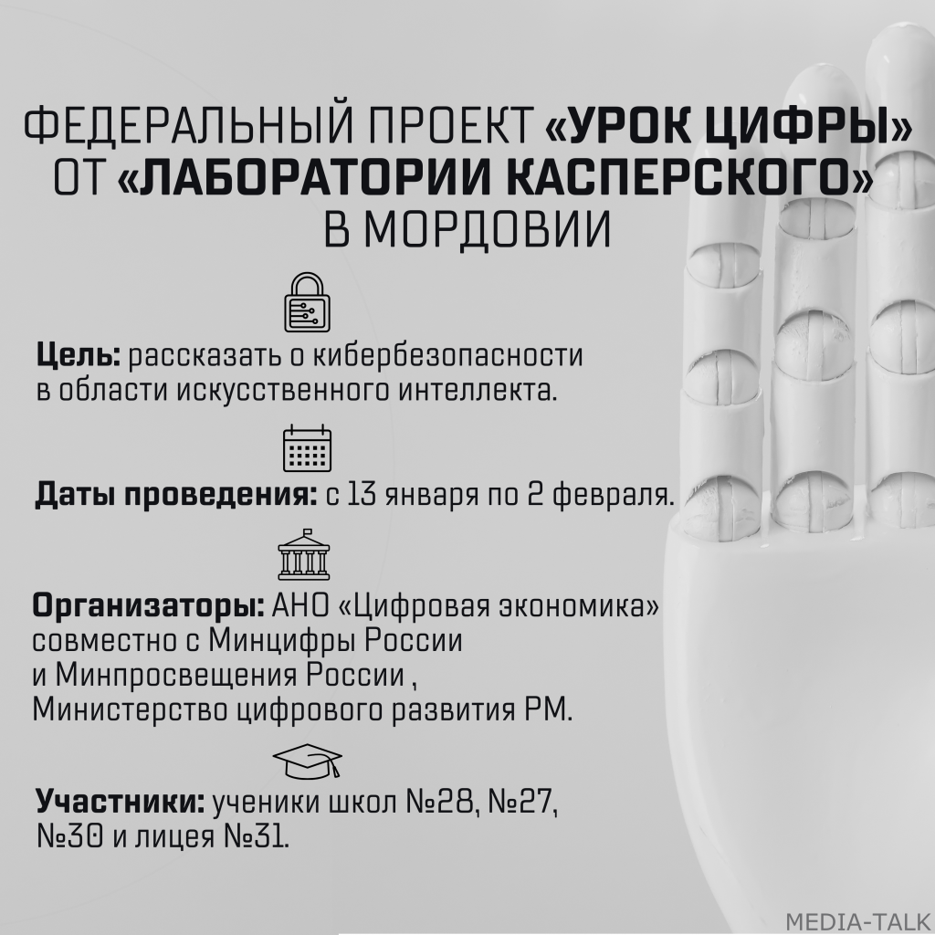 14 января. /MEDIA TALK/.Школы Мордовии примут участие в федеральном проекте «Урок цифры» от «Лаборатории Касперского» и узнают о кибербезопасности в области искусственного интеллекта. Проект пройдет с 13 января по 2 февраля. Школьники освоят безопасное применение нейросетей, узнают о технологиях машинного обучения и их использовании кибермошенниками. Занятия проведут сотрудники Министерства цифрового развития республики.