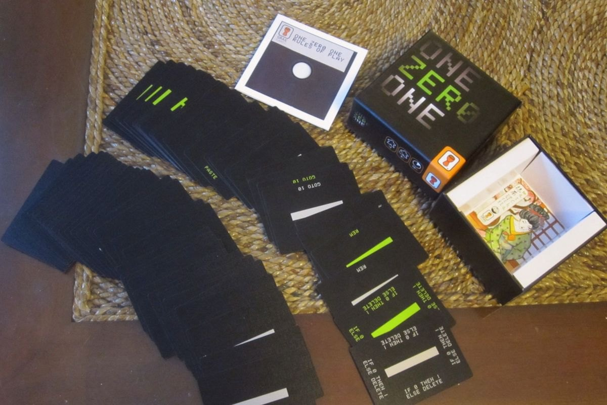 Мы нашли карточную настольную игру для ТРУ ИТ-шников. Это игра из Австралии One Zero One. Она дуэльная, от 8 лет и с 2013 года пережила уже три переиздания (последнее было в этом году). По механикам абстракт, где пять строк программы и в них и выкладываются определенным образом карты нулями и единицами (две колоды разных цветов). Главное набрать больше очков своего цвета до момента заполнения разрядов ряда, тогда строка программы отмечается за игроком. Начинают со строк 10 и 20, потом 30, 40 и 50 финал. Плюс есть модификаторы, переворачивающие карты с 0 на 1 и наоборот, перемещающие карты по рядам, запускающие код на картах и т п. На сайте Board Game Geek на странице игры есть ее правила и ссылки на обзоры. Хотели бы такую игру локализованной?