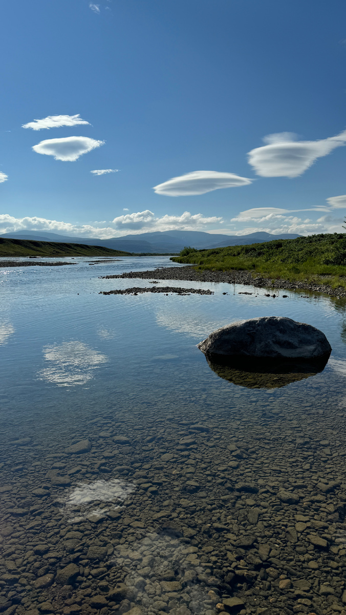 11 августа, сплав по Ния-Ю, полудневка Сегодня уже пятый день, как мы просыпаемся под ласковым северным солнцем. На небе красивые лентикулярные облака. После вчерашнего волока катамаранов, неплохо бы сделать передышку, перед прохождением порогов, но место, где мы встали, не сильно располагает провести здесь день. До входа в каньон осталось буквально три-четыре километров, но мы вчера не рискнули пойти сразу до порогов, так как не знали, что там со стоянками, да и в темноте и холоде тоже был не вариант искать там стоянку, поэтому решаем сейчас дойти до каньона, и там по обстоятельствам, если будет хорошее место встать на полудневку. По опыту прошлых походов знаю, что желаемое не всегда совпадает с действительностью, и вовсе не факт, что сегодня у нас случиться полудневка, поэтому, пока собирали лагерь и готовили завтрак, я решила все же помыться с утра, пока есть время и тепло. Тем более, что у нашей большой ватаги на сборы по утрам уходило минимум два часа. Два котелка горячей воды