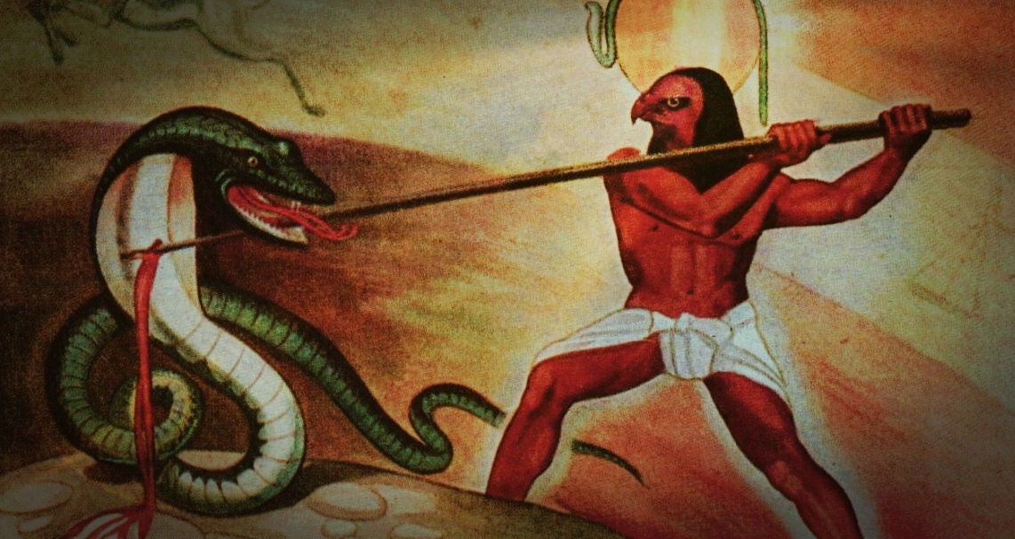 Большинство древнеегипетских богов выглядят как люди с головой какого-либо животного или птицы. Задолго до появления девятки главных богов - Великой Эннеады, из первозданных вод родился Апоп. Апоп в отличие от всех остальных, человеческого тела не имел, он изображался как огромный змей и за всё время его облик практически не претерпел никаких изменений. Как известно, Ра день и ночь кружит по миру на двух лодках. Днём находясь в Атете, он плывёт по небу освещая весь мир. Ночью же он пересаживается в Сектет и отправляется загробное царство. На своём пути, Ра преодолевает двенадцать врат и в конце концов вступает в схватку с поджидающим его Апопом. Цель у Апопа простая - победить Ра, чтобы мир навеки погрузился во тьму. Он выпивал всю воду и нападал на Ра, но тот каждый раз одолевал змея, ломал ему хребет и заставлял выплюнуть воды обратно. После этого Ра продолжал свой путь, и с каждым новым рассветом об этом узнавали люди. Раньше, когда Сет считался верным стражником и спутником Ра, в с