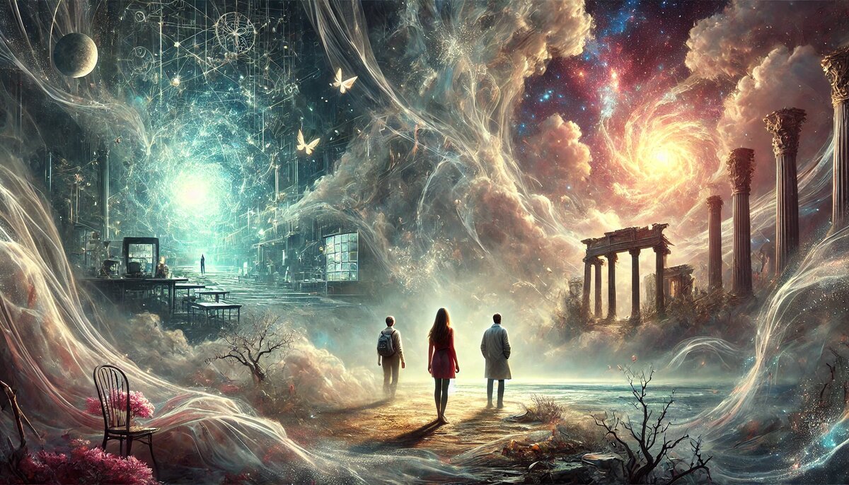Когда они вошли в туман, мир вокруг них изменился. Внезапно они оказались в месте, которое невозможно было описать. Это было не пространство, а скорее поток образов, звуков и ощущений. Они видели фрагменты своих воспоминаний, смешанные с видениями, которые не принадлежали им. Лиза увидела себя ребенком, играющим в парке, но парк был пустым, а небо — черным. Артем увидел свою лабораторию, но стены были покрыты странными символами, которые светились в темноте. Егор увидел храм, но теперь он был разрушен, а кристалл лежал в руинах.