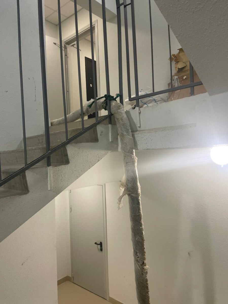 На видео вы увидели, что перила оторвались от такой нагрузки. Хозяйка квартиры уверяет, что заранее предупреждала УК об этом, но никто не приварил конструкцию до начала работ. Конечно, это не означает, что надо в любом случае привязывать сильно вибрирующий шланг к сломанным перилам: тут зона ответственности ляжет на всех. Не доламывать же стяжкой то, что не было отремонтировано вовремя! Мастера тоже хороши: им оплатили, приехали, привязали, не посмотрев, в каком состоянии перила... Лишь бы денег "срубить".