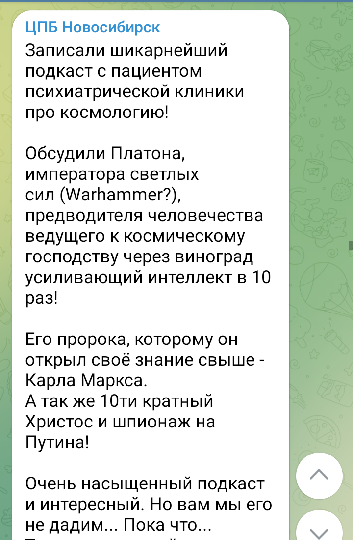 Её возглавляет Тимофей Крюковский. Есть она в Telegram и во ВКонтакте. Это ЦПБ Новосибирск. Он активно расширяет свои полезные контакты. Люди из его лаборатории переписываются с норвежскими специалистами. Кроме того, они читают Жиля Делёза и Рональда Лэйнга и анализируют эти тексты. Сам Тимофей работает в психиатрической лечебнице и читает Апостола Павла и Докинза. И, не поверите, он... сам стрижёт ногти больным и лечит их от грибка. Ребята, у нас есть много полезных и интересных публикаций. Наши финансовые курсы. Кроме того, у нас есть курс "Мужчина и мужественность". Вы можете на него записаться. Подробнее об этом курсе вы узнаете из статьи "Как мужику не стать гомосексуалистом". Кто ведёт все эти курсы? Об этом вы узнаете из статьи "Преподаватель курса". А это видео, где выступает как раз автор курса. "Арсений Юрьевич о синих китах и школьных стрелках в гостях у Дмитрия Пучкова (Гоблин)". Есть статья, в которой мы рассказываем о технологии "Цены в серебре. Кроме т