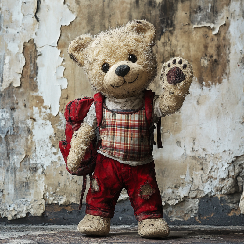Из кустов напротив скамейки выбрался плюшевый медвежонок в клетчатой безрукавке, красных штанах и красном же рюкзачке за спиной. Его шерсть красивого бежевого цвета немного свалялась, чуть запылилась. Он помахал лапой, пытаясь привлечь внимание зайца, но тот никак не отреагировал.
