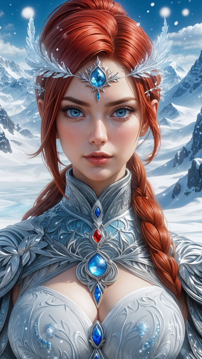 сверхдетальное цифровое искусство, демонстрирующее стеклянное, прозрачное, замороженное и покрытое льдом тело человеческой женской славянской красоты во всю длину, стоящее на снежном полу, рыжеволосые, с хвостом пони, детальное великолепное лицо, детальный симметричный круглый глаз радужной оболочки, замысловатые детали, удивительный рисунок, безумная текстура, мистический и волшебный вид глаз
