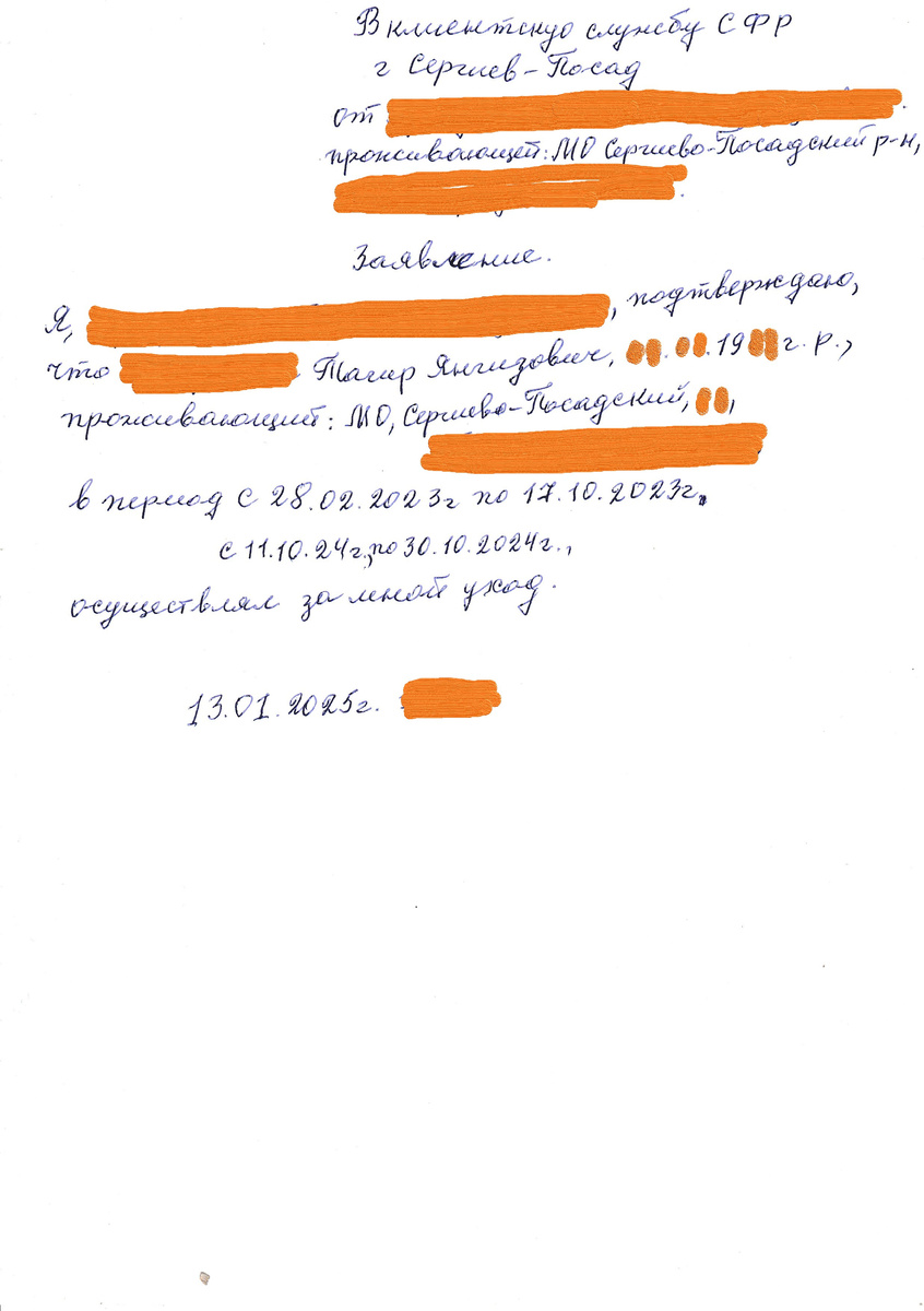 Образец Заявления для подтверждения ухода за пожилыми и что взять с собой в СФР.