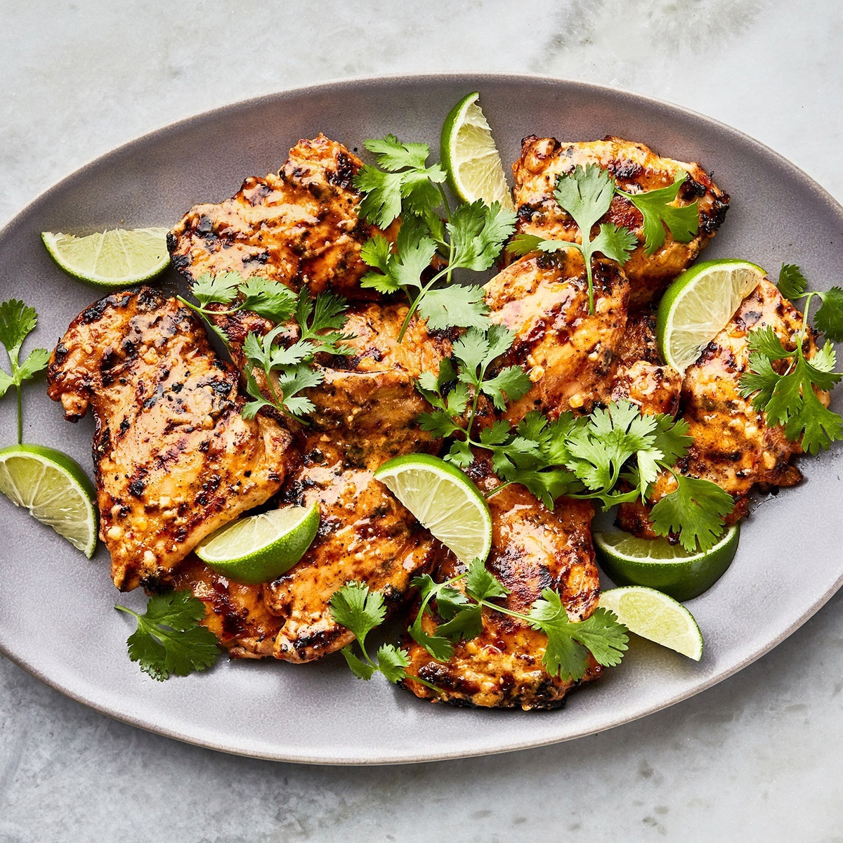 Ингредиенты: 900 г куриных бедер без кожи и костей, 150 мл кокосового молока, кружочек свежего имбиря ~ 2,5 см, 5 зубчиков чеснока, ¼ чашки пасты чили, 50 мл свежего лимонного сока, 2 ст.л коричневого сахара, 1 ст.л соли, 2 ст.л растительного масла, ½ чашка листьев кинзы, дольки лайма.