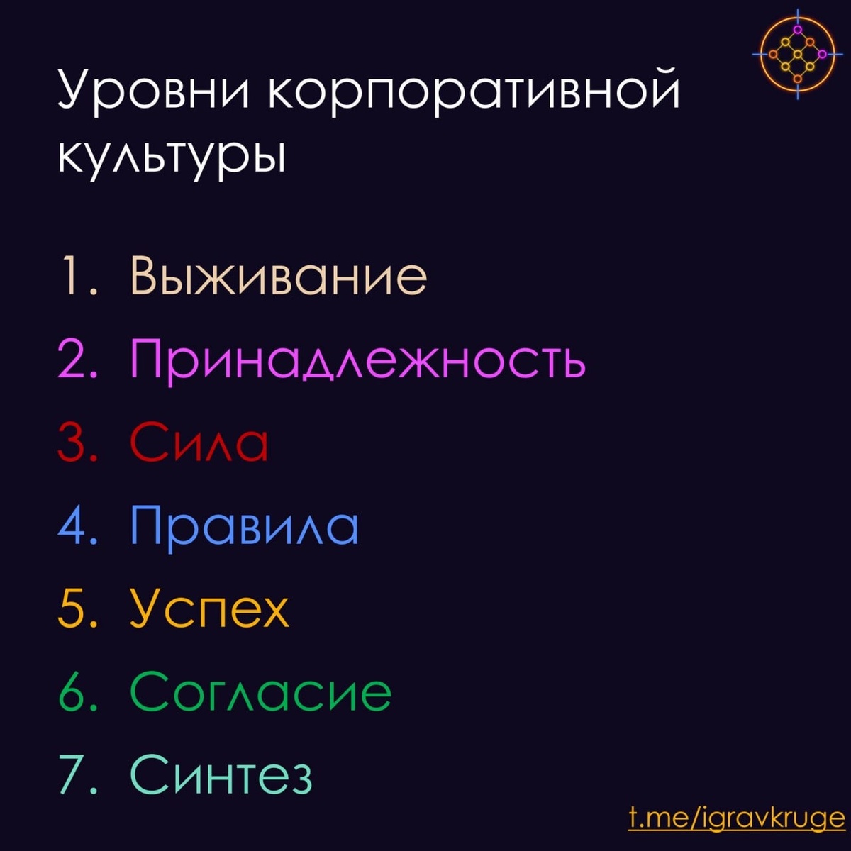 Корпоративная культура - это то, как сотрудники выбирают себя вести, когда за ними не наблюдает начальство. Управление корпоративной культуры не является академической наукой, но такие исследователи бизнеса, как Клер Грейвз или Дейв Логан сформировали широко распространенную классификацию корпоративной культуры по уровням. Разберем уровни корпоративной культуры в контексте целей менеджмента и работников. 1. Выживание. Работа идет не по плану или плана нет совсем. Менеджмент и работники тушат пожары, не успевают устранить одну проблему, как получают еще пять. За качество результата никто не отвечает. Ни руководитель, ни исполнители не считают, что могут что-то изменить. Цель у всех одна - выжить, не лишиться работы. 2. Принадлежность. Лидер компании организовал работу и сконцентрировал в своих руках всю власть. Единственный, кто отвечает за результат - лидер компании. Остальные отвечают за выполнение задач, которые он им поставил. Единственный, кто имеет возможность что-то изменить