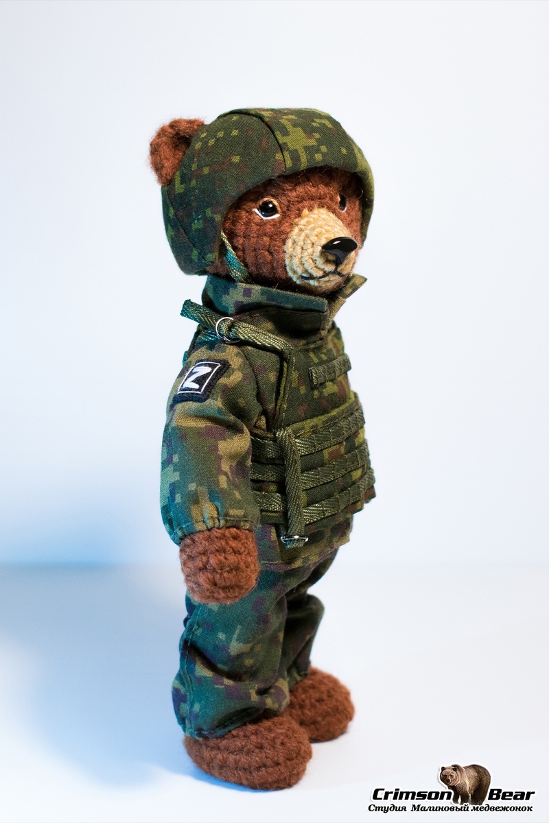 Размер медведя 14 см. Подвижная голова на шплинтовом креплении, лапы на меднопроволочном каркасе. Камуфляжный бронежилет. Каска из композита, сверху камуфляжный чехол. Нашивки флаг РФ и Z.