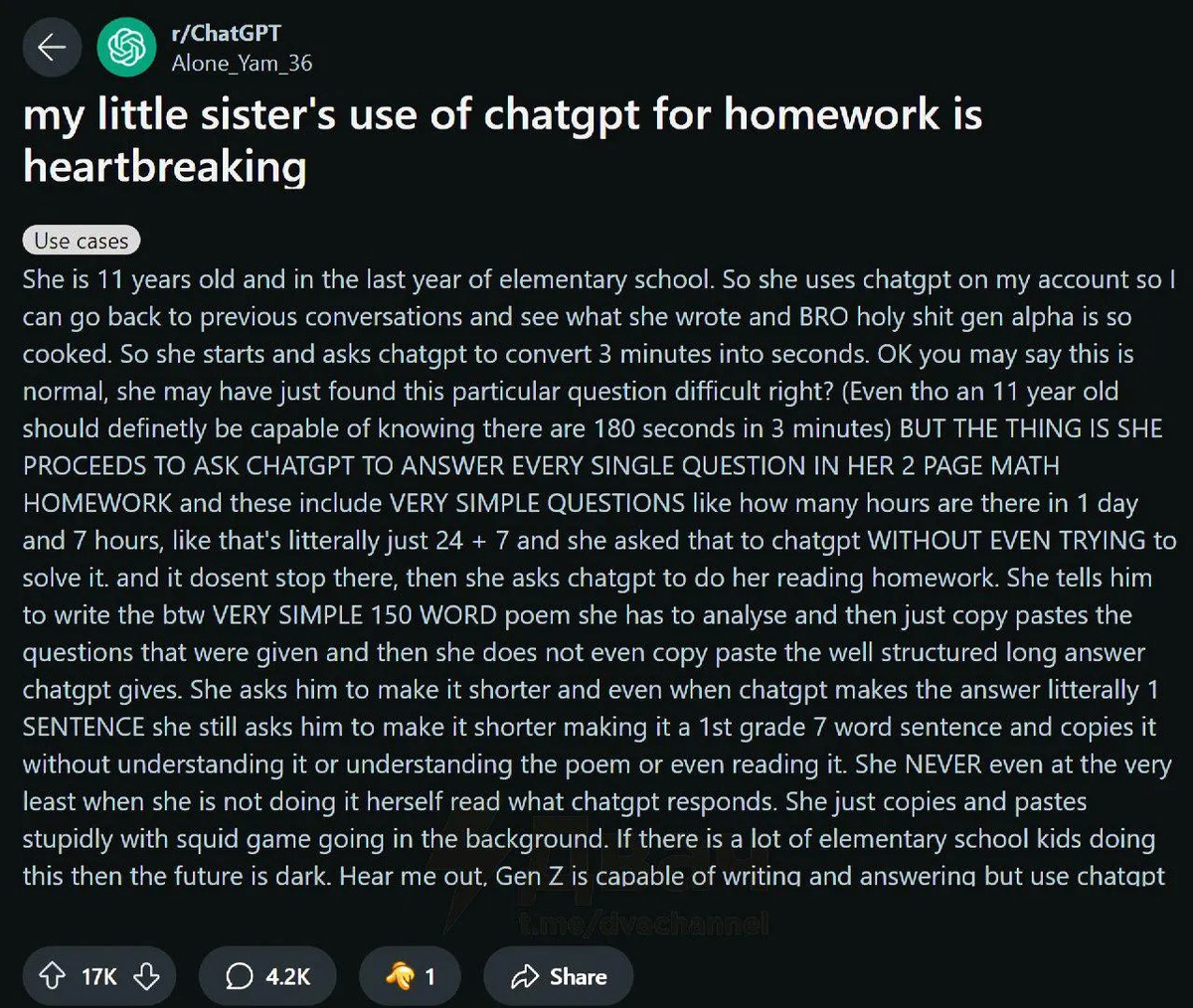 Если много школьников начальной школы делают такое, то будущее выглядит мрачным. Послушайте меня, поколение Z способно писать и отвечать, но использовать ChatGPT вот так — это что-то темное.