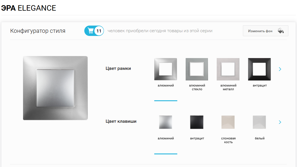 Компания ЭРА выпускает достаточно широкий ассортимент продукции в рамках серии ELEGANCE, включающей в себя розетки и выключатели для бытового применения. Особенностью является использование качественных материалов, в том числе металла и стекла, для придания изделиям необходимого эстетичного внешнего вида и лоска. Коллекция включает в себя достаточно широкую палитру цветов, основными из которых являются холодные оттенки серого, текстура под алюминиевое покрытие, но также присутствуют теплые пастельные тона, уравновешивая баланс коллекции. Что касается самих электроприборов, то можно заказать:
