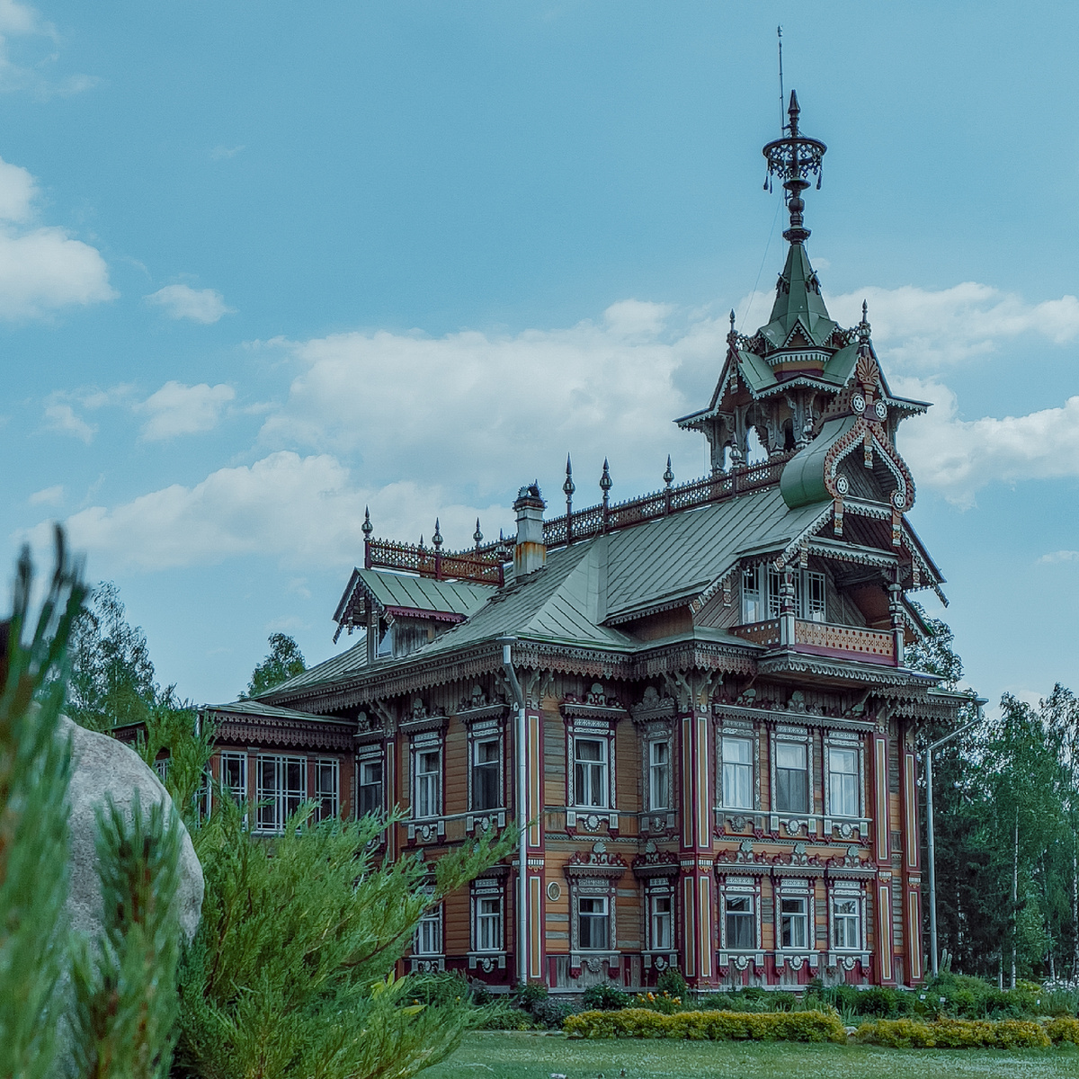 История этого Терема расположенного в Костромской области на расстоянии в 540 км. от столицы и берет свое начало в 1894 году, когда крестьянин - отходник Мартьян Сазонов начал его строительство.