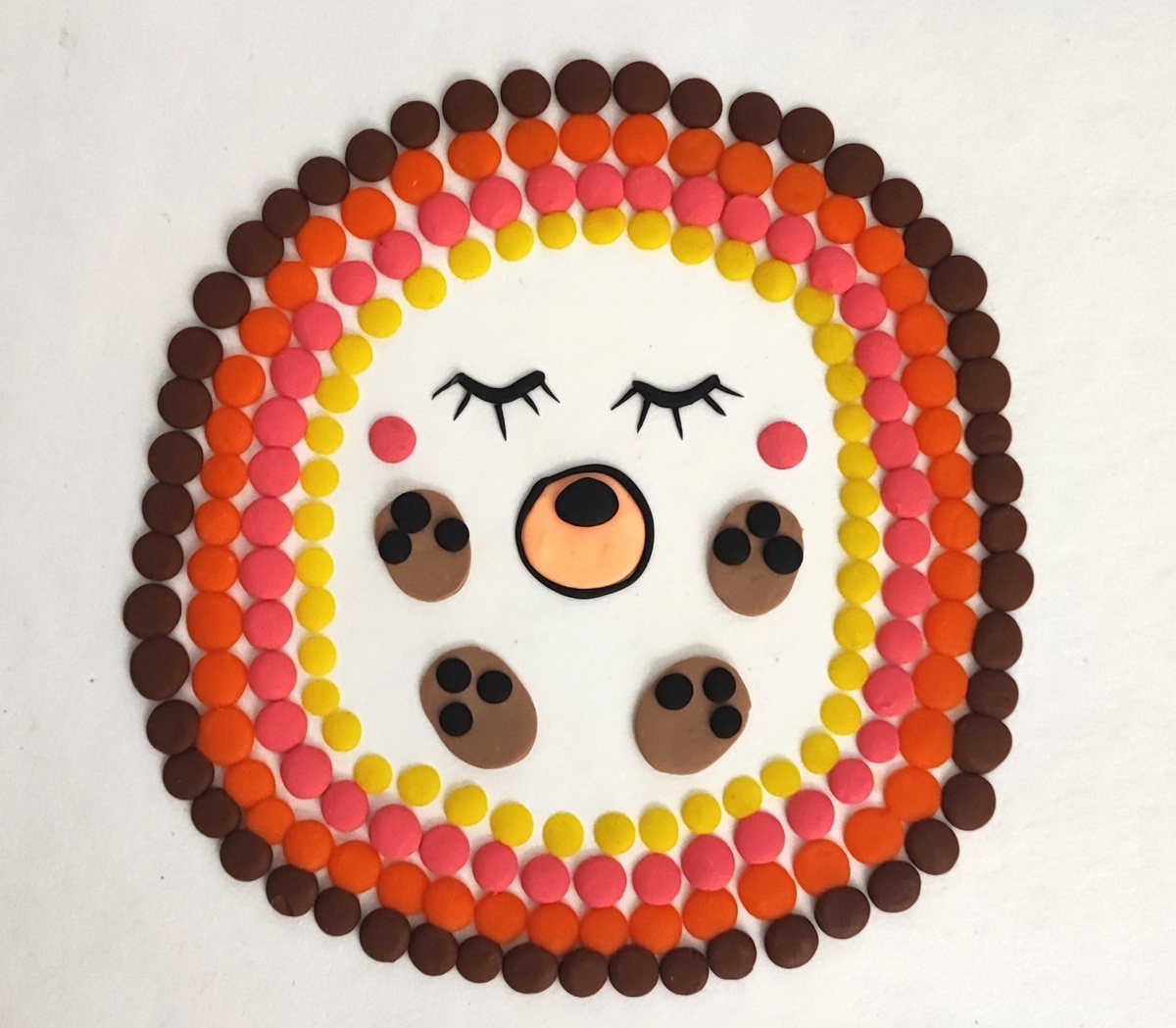 Сегодня мы с Вами будем создавать аппликацию из пластилина на картоне , где будет изображение маленького , спящего ёжика , способ лепки будет состоять из маленьких , разноцветных шариков . Данная методическая разработка предназначена для детей дошкольного и школьного возраста , родителей , педагогов и творческих людей . Изготовление аппликации из пластилина на картоне своими руками . Из оранжевого цвета пластилина раскатываем много маленьких шариков и прилепляем их на белый фон аппликации по кругу ( как показано на фото ) Таким же способом прилепляем второй ряд из коричневого цвета пластилина поверх оранжевых шариков. Из розового цвета пластилина лепим третий ряд шариков Из жёлтого цвета пластилина лепим четвертый ряд шариков Из чёрного цвета пластилина лепим закрытые глазки и четырьмя ресницами. Из светло- оранжевого цвета пластилина лепим один маленький шарик и после раскатываем его скалочкой , чтобы получилась лепёшка и стеком вырезаем форму продолговатого круга. Затем готову