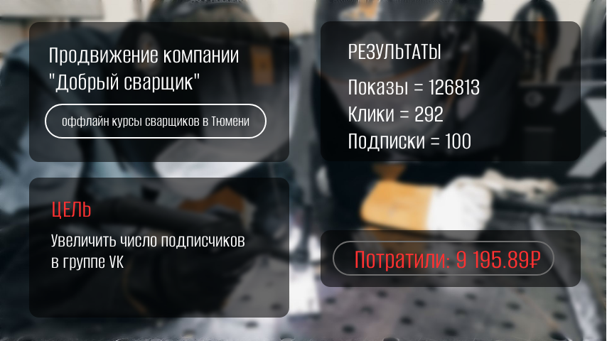 Делюсь первым опытом настройки VK Рекламы для увеличения подписчиков в группу образовательных услуг - курсы сварщиков в Тюмени. Клиент Наш собственный проект, который запустили в августе 2023г. Образовательные курсы по подготовке сварщиков с нуля. В 2024г. добавили сварочные услуги (ремонт/изготовление металлических изделий). На момент запуска рекламной кампании, платные методы продвижения не использовали. Вели группу самостоятельно, регулярно размещали контент (фото, видео, отзывы учеников). Целевая аудитория для теста: Мужчины и женщины от 18 до 50 лет, проживающие в Тюмени и области Аудитории: 8 самых популярных городских сообщесв в VK Интересы не использовала Места показов: соцсети, рекламной сети и проектов VK Подготовка объявлений и запуск рекламной кампании: Главное УТП - реальная практика и официальные документы, т.к. в городе никто не предоставляет такой комплекс в одном месте. Либо обучают онлайн, либо продают только корочки. Альтернатива - государственные образовательные