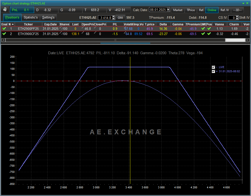 Давайте представим себе, что мы, вдруг, решили подзаработать на распаде временной стоимости и прямо сегодня продать стрэнгл используя АЕ деривативы на ETH.