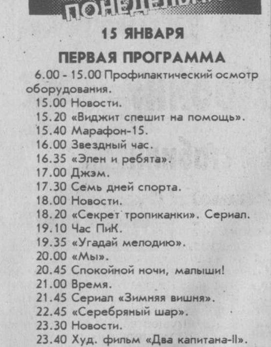 Данная публикация создана по просьбе во вчерашних комментариях - сделать обзор телепрограммы за 15 января 1996 года.