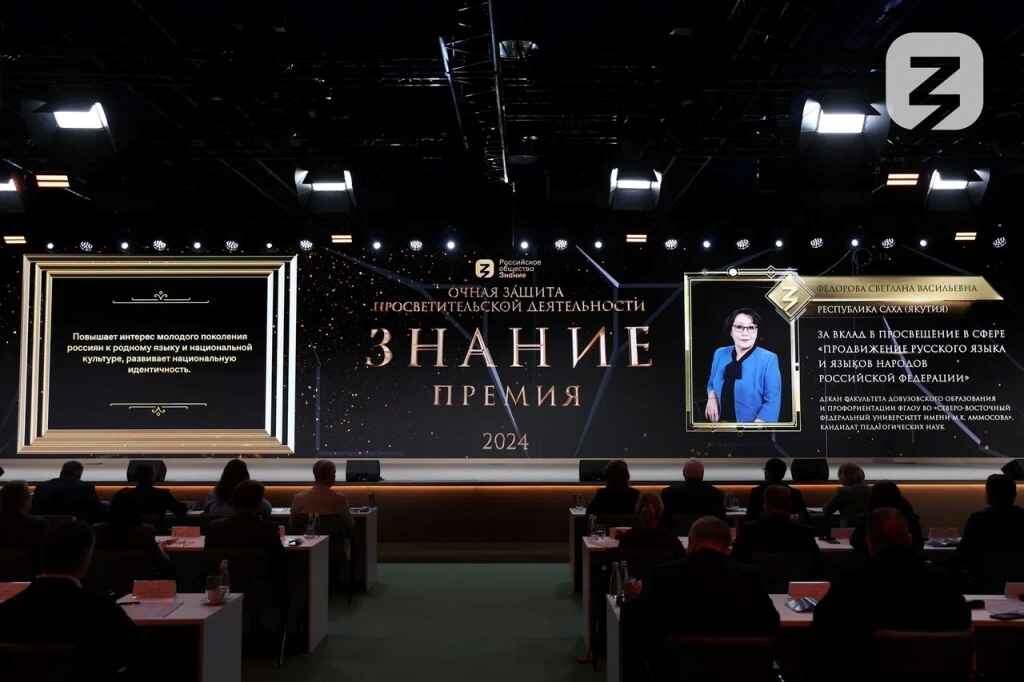 Декан факультета довузовского образования и профориентации СВФУ имени М.К. Аммосова, кандидат педагогических наук Светлана Федорова претендует на просветительскую награду Знание.Премия – 2024 в номинации «За вклад в просвещение в сфере «Продвижение русского языка и языков народов Российской Федерации»». Об этом сообщили в пресс-службе РО «Знание». Отдать свой голос за претендента на победу, а также любых других понравившихся номинантов может любой житель Якутии в рамках народного голосования, используя специальное мини-приложение в социальной сети ВКонтакте. Голоса принимаются по 15 января 2025 года. Светлана Федорова — организатор Олимпиады школьников по родным языкам и литературам народов России, которая помогает сохранять и развивать культурное и языковое наследие страны. Это единственная в России олимпиада федерального уровня, где школьники из 66 регионов и 15 стран изучают и углубляют знания по 54 языковым профилям, включая русский как родной для соотечественников за рубежом и рус