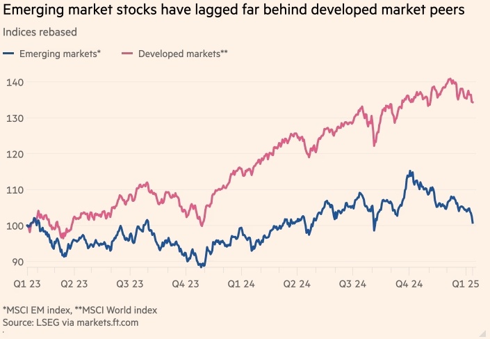 Акции развивающихся рынков значительно отстают от акций развитых рынков. Индексы перебазированы. Развивающиеся рынки*. Развитые рынки**. *Индекс MSCI EM, **Индекс MSCI World. Источник: LSEG через markets.ft.com