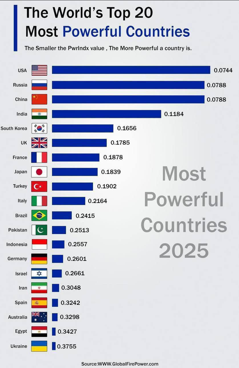 …если и есть в этом рейтинге разумная составляющая, то вот она. Зарубежные военные специалисты прекрасно понимают, что Россия воюет не с Украиной. Иначе с чего бы 2-е место три года давит двадцатое. А двадцатое еще и на территории 2-й строчки сидит, вцепившись в Курскую землю. Всё потому, что двадцатое место поддерживают 54 страны. …Ну а в целом - с одной стороны, всё ясно: США и РФ - имеют сильные армии. Но покажи этот рейтинг в Афганистане и в Сирии… И сразу возникают нюансы. Из позитивного: а армия США сдюжила бы, если б ее давили 54 страны?