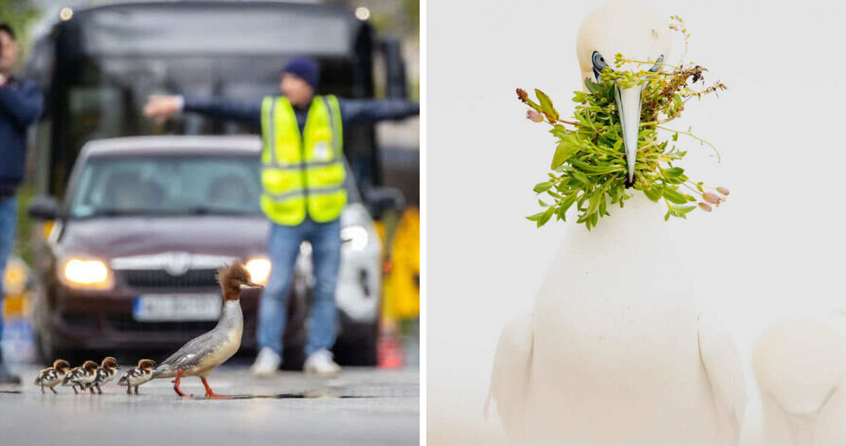 Для варшавского гусарки (Mergus merganser) сезон размножения стал весьма напряженным. Утята рождаются в парке примерно в километре от реки Висла. Каждая утка-самка должна как можно быстрее перевезти своих детенышей к реке, потому что это единственное место в парке, где есть еда и кров. Чтобы попасть на реку, утятам необходимо пересечь два канала и пройти через три подземных хода, созданных специально для этой цели. Последнее препятствие — широкое шестиполосное шоссе. Ежегодно группа волонтеров помогает им перейти эту опасную дорогу, перекрывая движение. На этом изображении мы видим утку, перебегающую дорогу, потому что она отказалась воспользоваться ближайшим темным подземным переходом. Волонтер перекрывает движение, пока оператор снимает сцену. Будем надеяться, что добровольцев, чтобы остановить движение, всегда найдется достаточно!