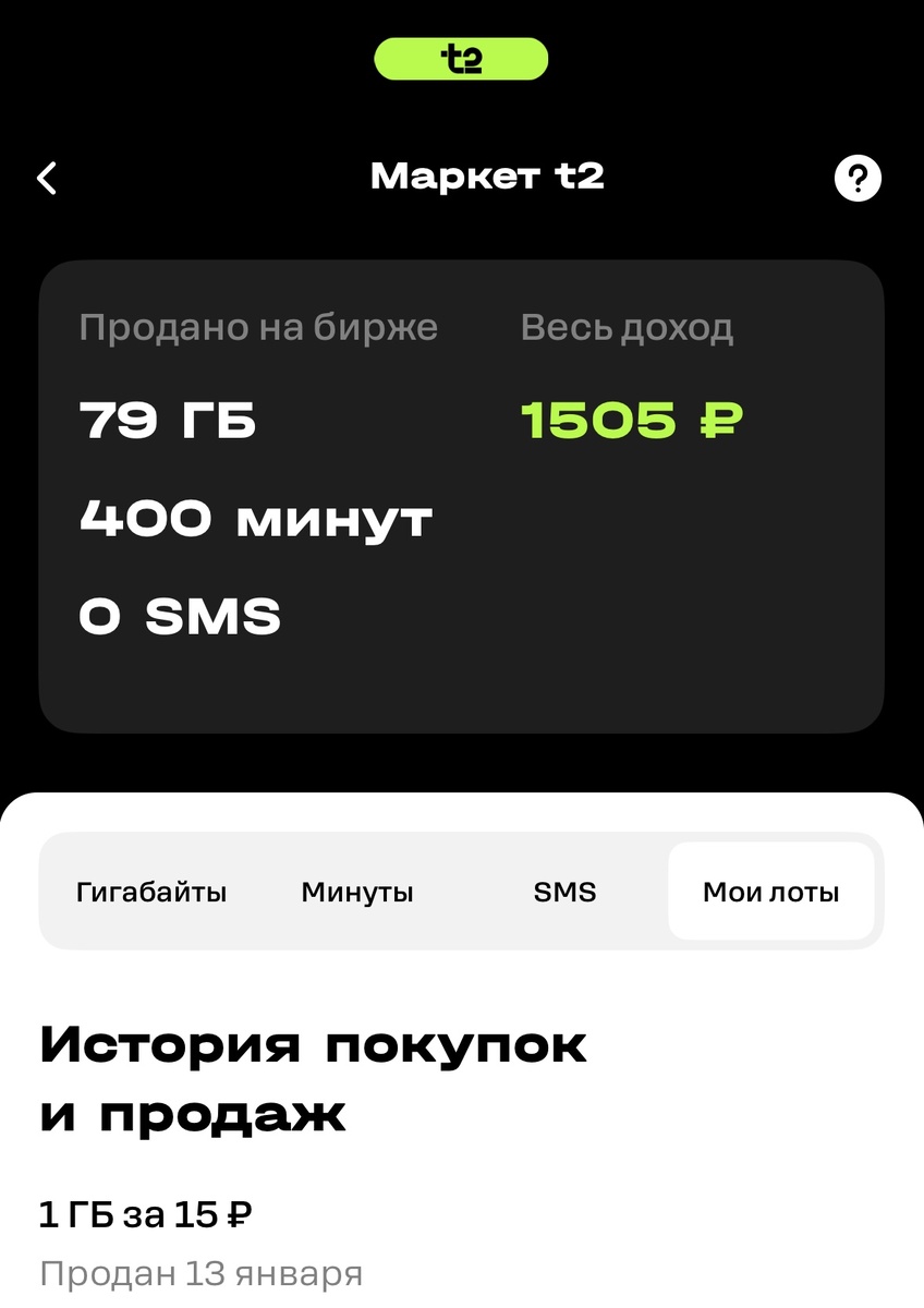 Теле 2 когда-то предлагал очень выгодные тарифы в нашем регионе, и я решилась уйти к ним от Мегафона, но те времена прошли, цена растет примерно каждый месяц и приходится искать способы оптимизации этих расходов... Из плюсов - Теле 2 предлагает продавать ненужные Гб и минуты на маркете и этим предложением я и воспользовалась. 1 Гб стоит 15 рублей, продать можно все, что входит в Ваш тариф, кроме остатков, перенесенных с прошлых месяцев. Процесс продажи очень простой, выставляете лот, он уходит в топ и в это время его могут купить, или не купить. Если в течение 5-10 минут лот не выкупают, то уже и не купят, тогда его можно отозвать и пользоваться самому, продать заново его не получится :( Тоже самое происходит с минутами - Вы продаете блок 50 минут по цене 40 рублей. Сразу скажу, что минуты берут хуже, но несколько раз мне везло и с ними. По моим наблюдениям лучше всего продажи идут в 12-13 по времени Мск. Возможно в обед люди докупают себе возможность поболтать или посерфить в Интерне