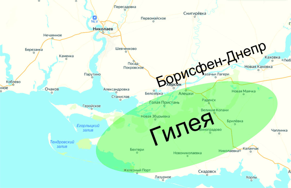 Почему в устье самого Днепра они не построились, бог весть. Может из-за нестабильности русла, а может, местные скифы не позволяли. Но мне, кстати, в названии населённого пункта Голая Пристань, слышится Гилея. 😉