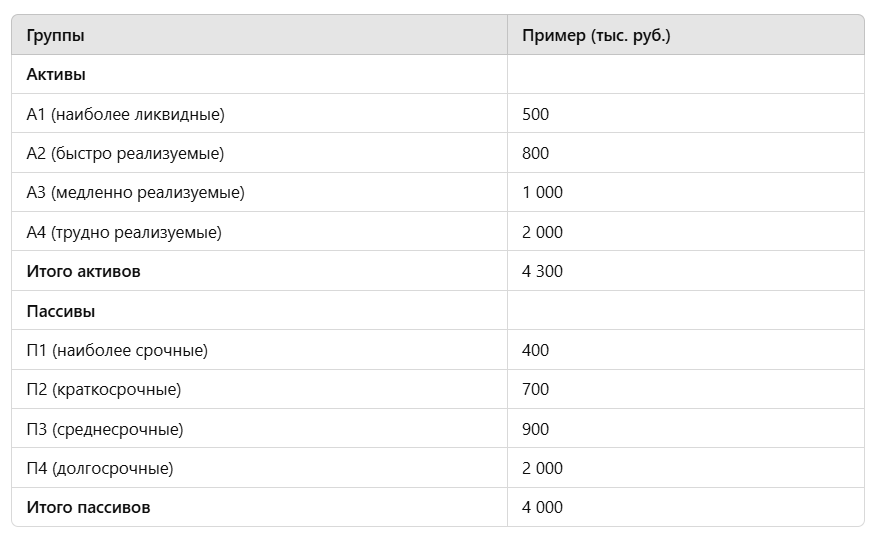 Для оценки ликвидности в классическом виде смотрят, как каждая группа активов закрывает соответствующую группу обязательств: