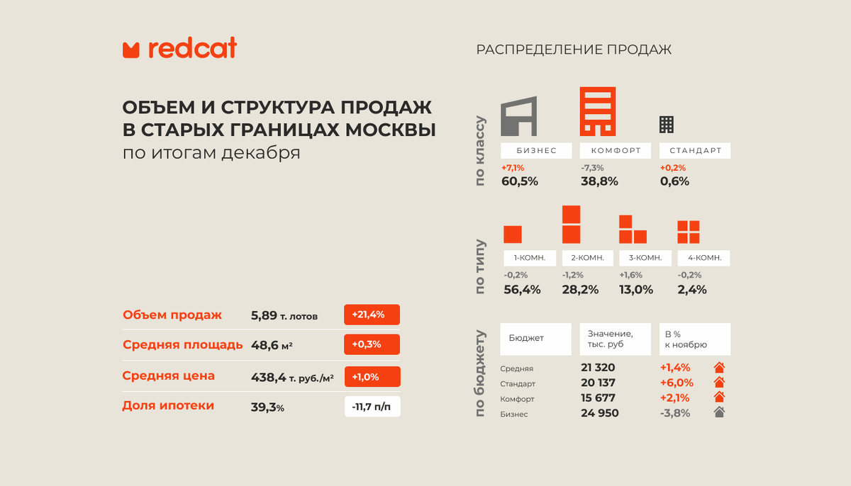 Средний бюджет на фоне произошедших изменений, показал прирост на уровне 1,4%, стоимость покупки квартир поднялась до 21,32 млн. руб. Бюджеты в сегменте стандартного жилья в декабре поднялись на 6,0% до 20,14 млн. руб., в сегменте комфорт-класса за месяц прибавили 2,1%, средняя цена лота составила 15,68 млн. руб., а в новостройках бизнес-класса бюджет снизился на 3,8% до 24,95 млн. руб.