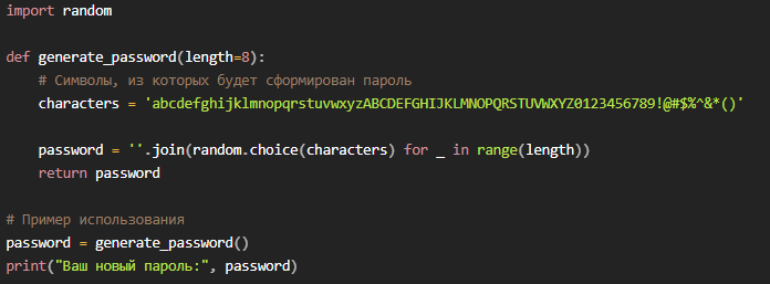 Приветствую вас, друзья! Сегодня мы разберемся, как генерировать случайные пароли с помощью языка программирования Python. Это будет полезно тем, кто хочет создать надежный пароль для защиты своей информации, а также для тех, кто просто хочет попробовать себя в программировании. Зачем нужен генератор паролей? Мы живем в эпоху цифровых технологий, когда наши данные хранятся в интернете, и важно обеспечить их безопасность. Использование слабых паролей может привести к утечке данных, поэтому генерация сложных и непредсказуемых паролей становится необходимостью. Что такое Python? Python — это высокоуровневый язык программирования общего назначения, который известен своим простым синтаксисом и читаемостью кода. Он отлично подходит для новичков, потому что позволяет быстро писать и тестировать программы без необходимости глубокого погружения в сложные концепции программирования. Как работает генератор паролей? Для создания генератора паролей нам потребуется использовать модуль random, которы