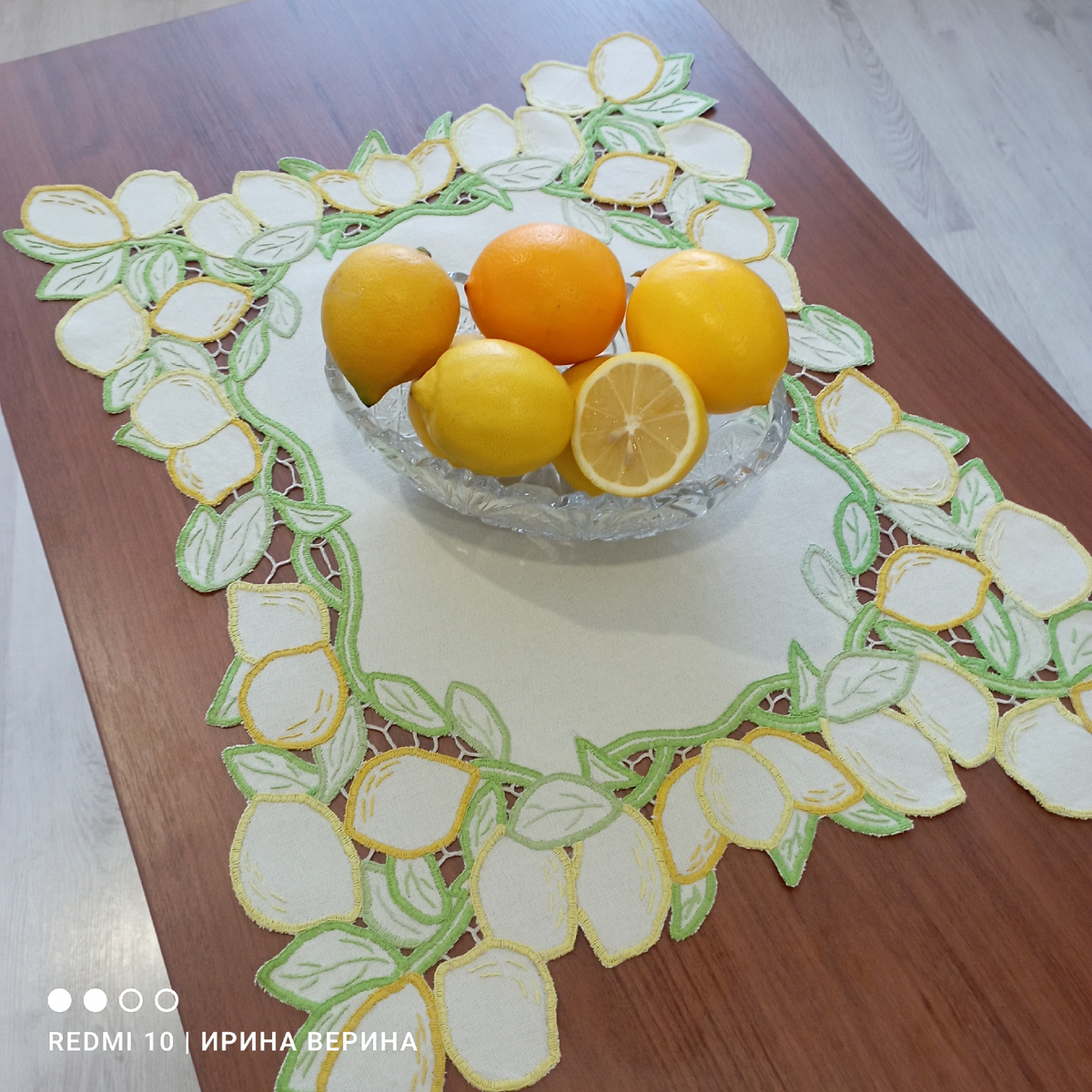 Всем здравствуйте! Вот и готовы мои лимоны, и своей работой я осталась очень довольна. Размер салфетки в готовом виде: 40*50, по диагонали 70 см. Материал - лен, нитки - мулине Гамма в 2 сложения. Да, в процессе вышивки пришлось сделать небольшие изменения. При подборе цвета ниток для всех деталей в начале работы не совсем представляешь их сочетание между собой. Замечаешь это только в конце работы. Потому распорола угловые лимоны и заменила светлый тон на более темный. Так вышивка стала выглядеть более выразительнее. Благодарю всех за просмотр! Вдохновляйтесь и вышивайте с удовольствием!