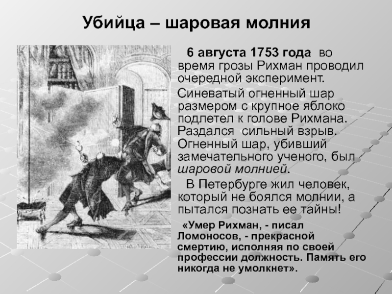 Что знает наука о шаровой молнии? На сегодняшний день не больше чем знал Ломоносов. Считается, что это плазменный шар, разных цветов и размерами от теннисного мячика и до несколько метров диаметром. Шаровая молния может двигаться против ветра. Проходить через стекла и стенки, иногда взрывается и оставляет в стеклах маленькие дырочки или оплавленные дыры.