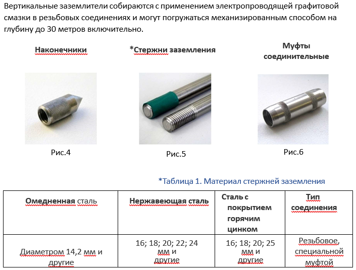 - особенностью конструкции стержней заземления, наконечников и муфт соединительных и монтажных, зажимов и применяемыми материалами при их изготовлении;